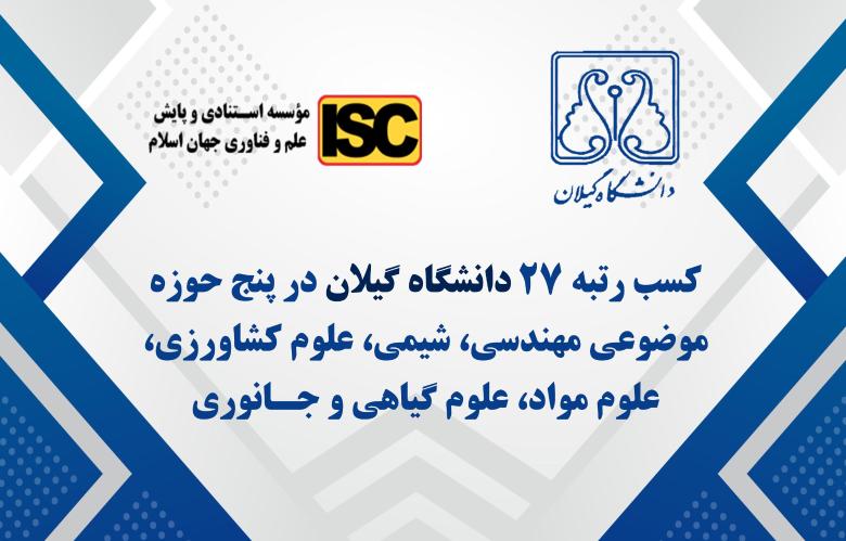 بنا بر اعلام مؤسسه استنادی و پایش علم و فناوری جهان اسلام (ISC)، در اعلام آخرین نتایج پایگاه شاخص های اساسی علم (ESI)، دانشگاه گیلان در پنج حوزه موضوعی مهندسی، شیمی، علوم کشاورزی، علوم مواد، علوم گیاهی و جانوری  با 7211 مدرک، 95014 استناد و 43 مقاله برتر، رتبه 27 در میان دانشگاه ها و مؤسسات پژوهشی پراستناد برتر جهان را کسب کرد. بنا بر این گزارش، در بازه زمانی 2014-2024، تعداد 9019 دانشگاه و مؤسسه پژوهشی در تمامی حوزه های موضوعی انتخاب شده اند که 134 دانشگاه و مؤسسه پژوهشی از ایران می باشد. شایان ذکر است پایگاه شاخص های اساسی علم (ESI) یکی از پایگاه های اطلاعاتی مؤسسه کلاریویت آنالیتیکس است که به معرفی پژوهشگران، مؤسسات، انتشارات و کشورهای برتر در حوزه های موضوعی مختلف می پردازد. مؤسسه کلاریویت آنالیتیکس، مؤسسات پراستناد برتر دنیا را در 22 حوزه  شیمی، علوم گیاهی و حیوانی، ایمنی شناسی، زیست شناسی و زیست شیمی، علوم اعصاب و رفتار، زمین شناسی، فیزیک، میکروبیولوژی، روانپزشکی/ روان شناسی، علوم فضا، پزشکی بالینی، ریاضیات، محیط زیست و بوم شناسی، داروشناسی و سم شناسی، اقتصاد و تجارت، علوم رایانه، زیست شناسی مولکولی و ژنتیک، مهندسی، علوم کشاورزی و علوم مواد، علوم اجتماعی، کلیات و چند رشته ای انتخاب می کند. بنابراین در هر حوزه موضوعی، دانشگاه ها و مؤسسات پژوهشی انتخاب شده بیشترین تعداد استنادها را دریافت کرده اند.