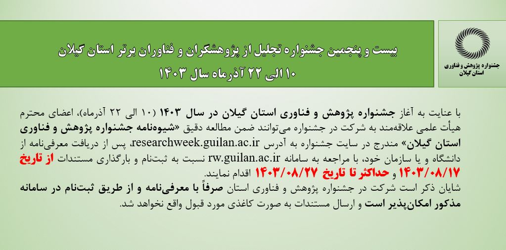 با عنایت به آغاز جشنواره پژوهش و فناوری استان گیلان در سال 1403 (10 الی 22 آذرماه)، اعضای هیأت علمی علاقهمند به شرکت در جشنواره میتوانند ضمن مطالعه دقیق «شیوهنامه جشنواره پژوهش و فناوری استان گیلان» پس از دریافت معرفینامه از دانشگاه و یا سازمان خود، با مراجعه به سامانه rw.guilan.ac.ir نسبت به ثبتنام و بارگذاری مستندات از تاریخ 1403/08/17 حداکثر تا 1403/08/27 اقدام نمایند.